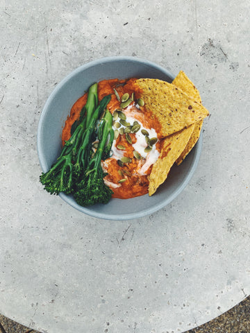 Next up: Cat. She’s a fan of the Piri Piri Pot, and accessorized it with a dollop of coconut yoghurt, tender stem broccoli and a sprinkling of pumpkin seeds for good measure. Plus, a couple of crisps for essential dipping.