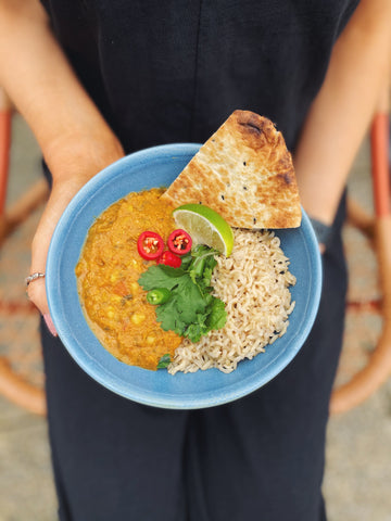 Here’s Georgie’s entry – an Indian Feast using her favourite Creamy Coconut Turmeric Daal. She’s spiced things up with a side of naan, coconut rice, some fresh red chillies, coriander and a squeeze of lime.